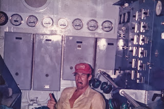 Top photo one of our loyal followers Clyde Williams In the control room of the Jeannine 1982 as the assistant heading to Samoa with full load. Love the casamar hat and cigar.