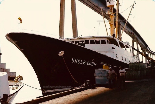 The Beautiful Tuna Seiner Uncle Louie , unloading at Bumble Bee Seafoods in the early 1980’s. Built by Campbells Shipyard in 1978. Share your photos at sdtunaboats@cox.net or on X @sdtunaboats also on Instagram @sandiegotunaboats
