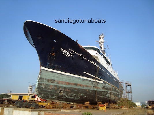 Cayude on dry dock. Built as the Cindy Ann by Martinac in 1976. Send your favorite pictures to sdtunaboats@cox.net