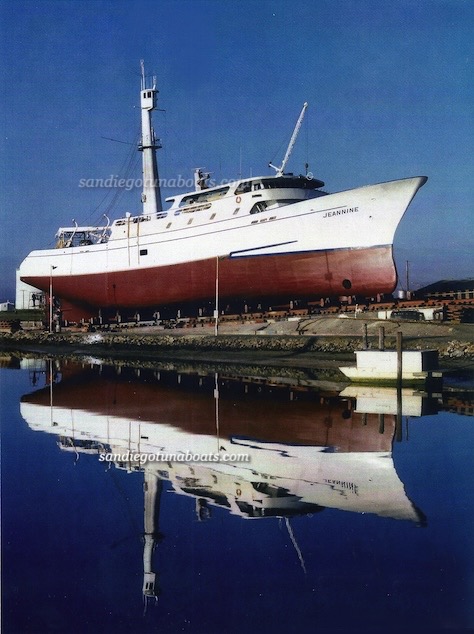 This is a beautiful photo of the Tuna Seiner Jeannine, on dry dock. Built by Martinac Shipyard in 1974. Share your photos at sdtunaboats@cox.net or on X @sdtunaboats also on Instagram @sandiegotunaboats